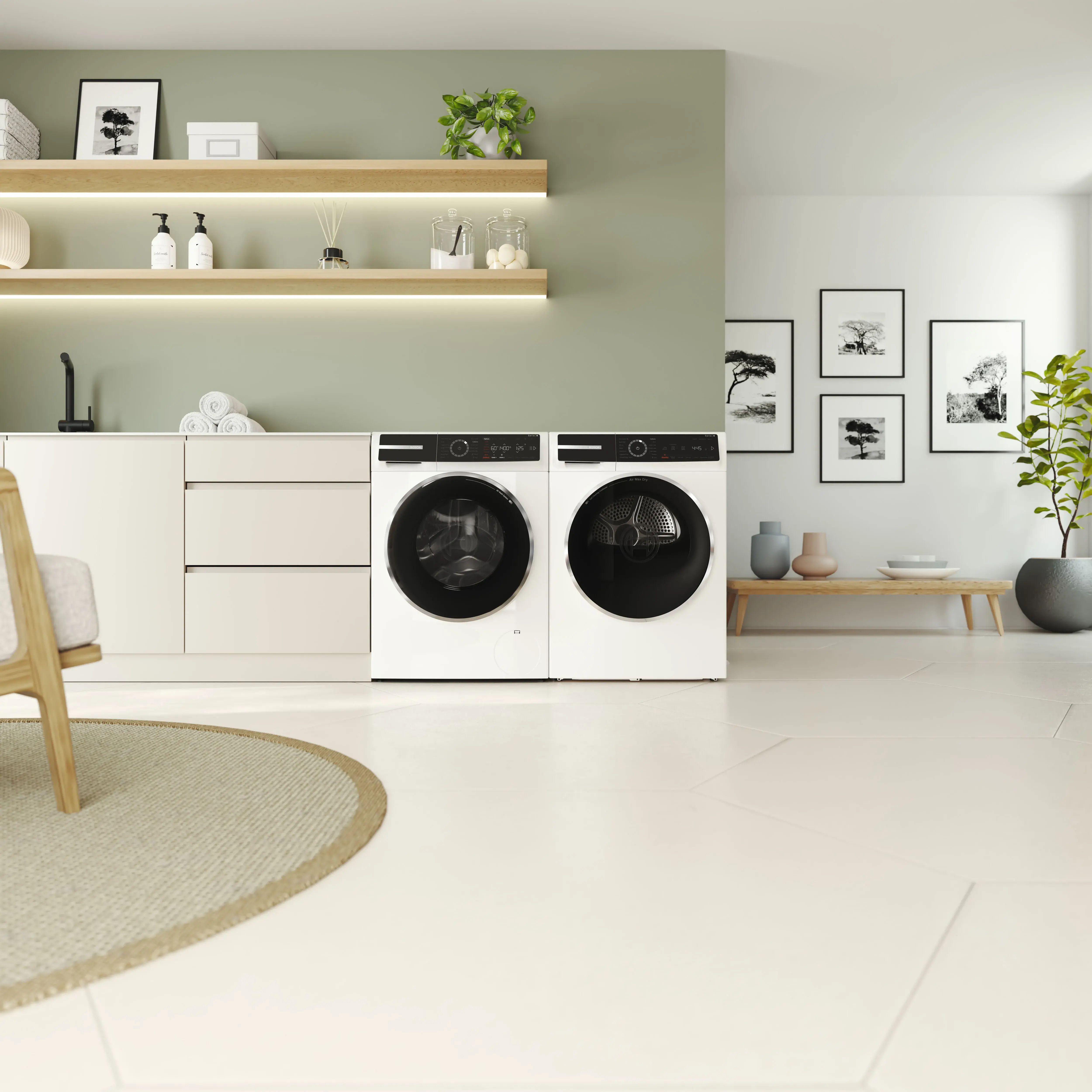 Moderne Haushaltsgeräte wie Kühlschrank, Waschmaschine und Geschirrspüler in hellem Raum.